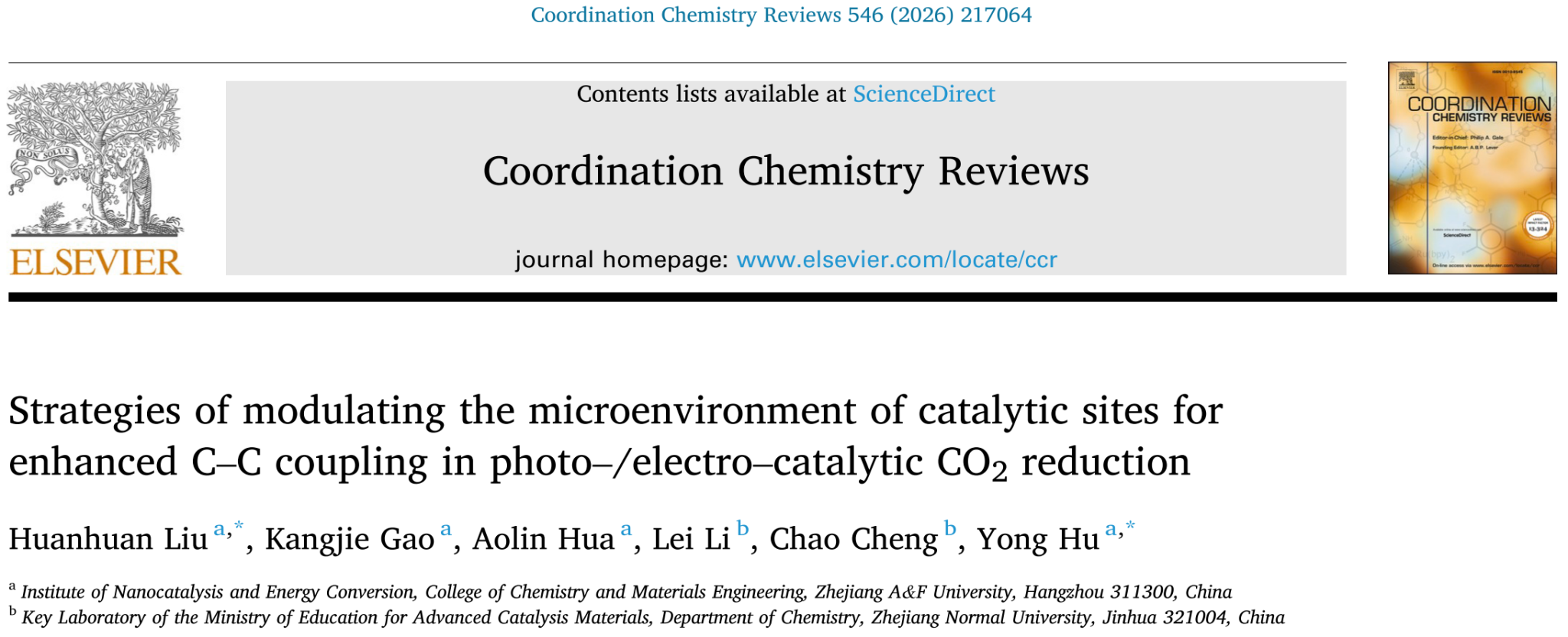 近日,化材学院胡勇教授团队在国际顶尖综述期刊《Coordination Chemistry Reviews》(中科院一区TOP,IF=23.5)上发表了题为“Strategies of modulating the microenvironment of catalytic sites for enhanced C–C coupling in photo–/electro–catalytic CO2reduction”(调控催化位点微环境以增强光/电催化二氧化碳还原中碳-碳偶联的策略)的综述论文。该论文系统综述了催化位点微环境在光/电催化过程中对碳-碳偶联行为的调控机制,深入探讨了当前技术面临的瓶颈问题以及新兴解决方案,并进一步提出了下一代催化体系的可行设计原则,为推动二氧化碳向高附加值化学品的转化应用提供了重要参考。论文通讯作者为化材学院胡勇教授,共同通讯作者为刘欢欢博士,浙江农林大学为唯一通讯单位。