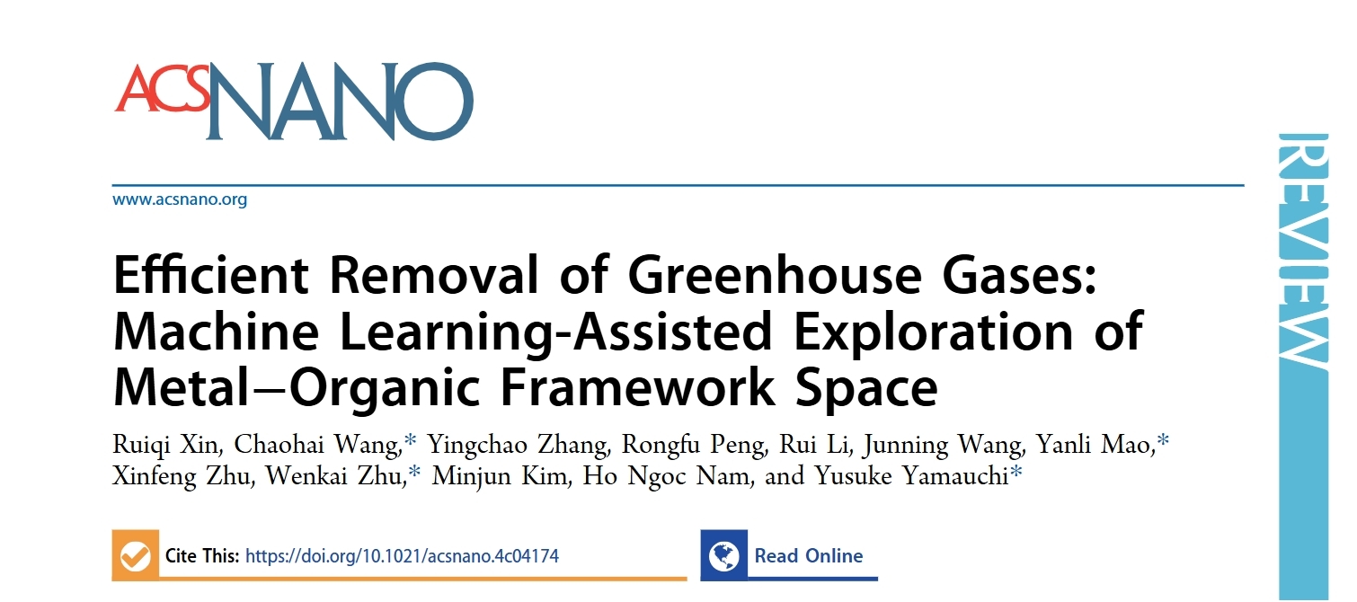 2024年7月2日,林业工程学科绿色家居材料团队在国际材料领域顶级期刊《ACS Nano》(中科院1区,IF=15.8)在线发表题为“Efficient Removal of Greenhouse Gases: Machine Learning-Assisted Exploration of Metal−Organic Framework Space”(机器学习赋能面向温室气体去除的金属有机骨架)的综述论文。第一作者是该团队硕士研究生辛瑞麒,通讯作者为浙江农林大学朱文凯,合作作者包括河南城建学院王超海教授、毛艳丽教授以及昆士兰大学Yusuke Yamauchi教授。浙江农林大学化学与材料工程学院为该论文第一单位和通讯作者单位。