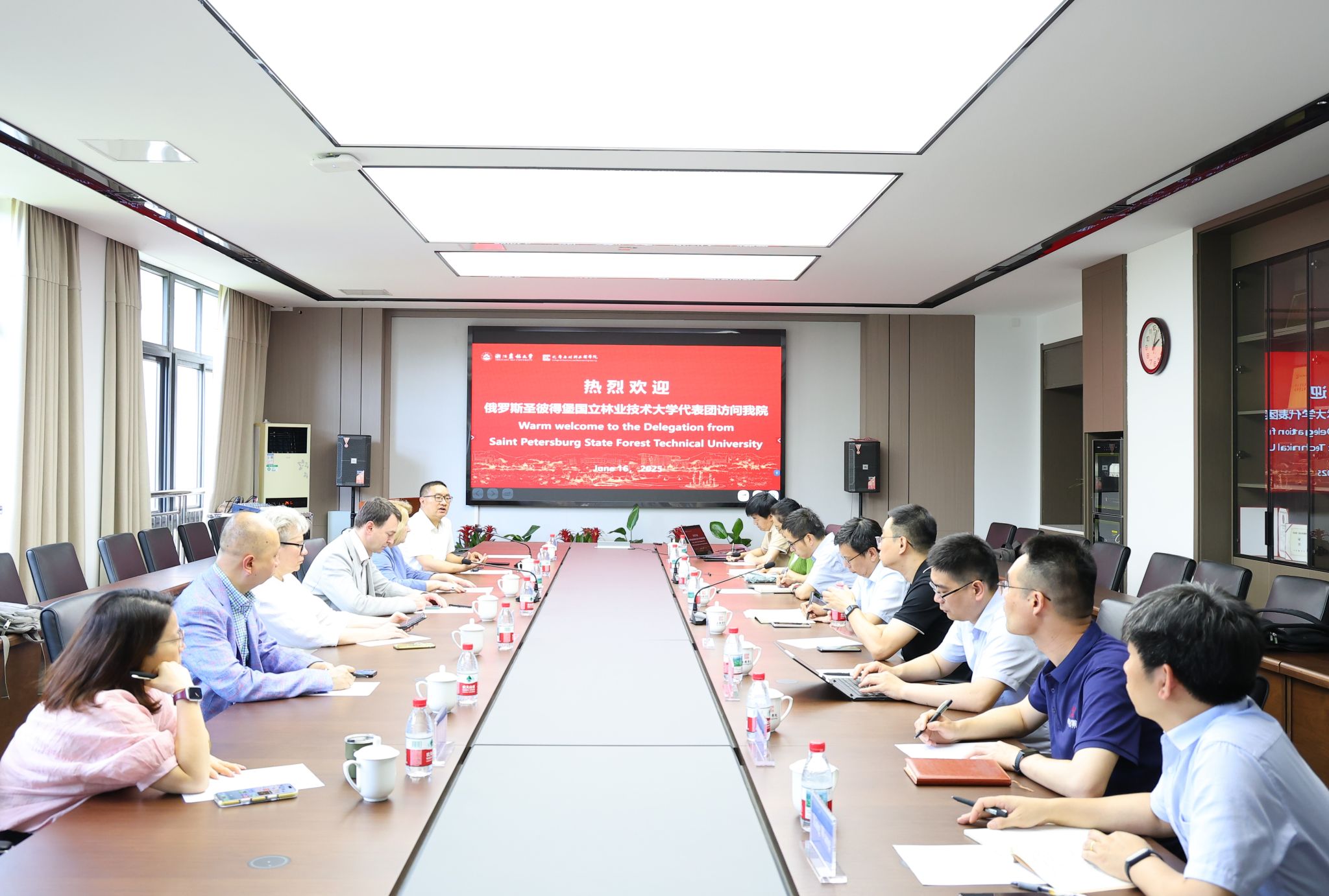 王磊处长介绍了俄罗斯圣彼得堡国立林业技术大学在林业技术领域的学科优势,特别指出双方在纸浆造纸等林木加工领域开展合作的重要性;学院首先对来宾表示欢迎,并介绍了学院整体情况和相关科学研究、成果转化、合作意向等。